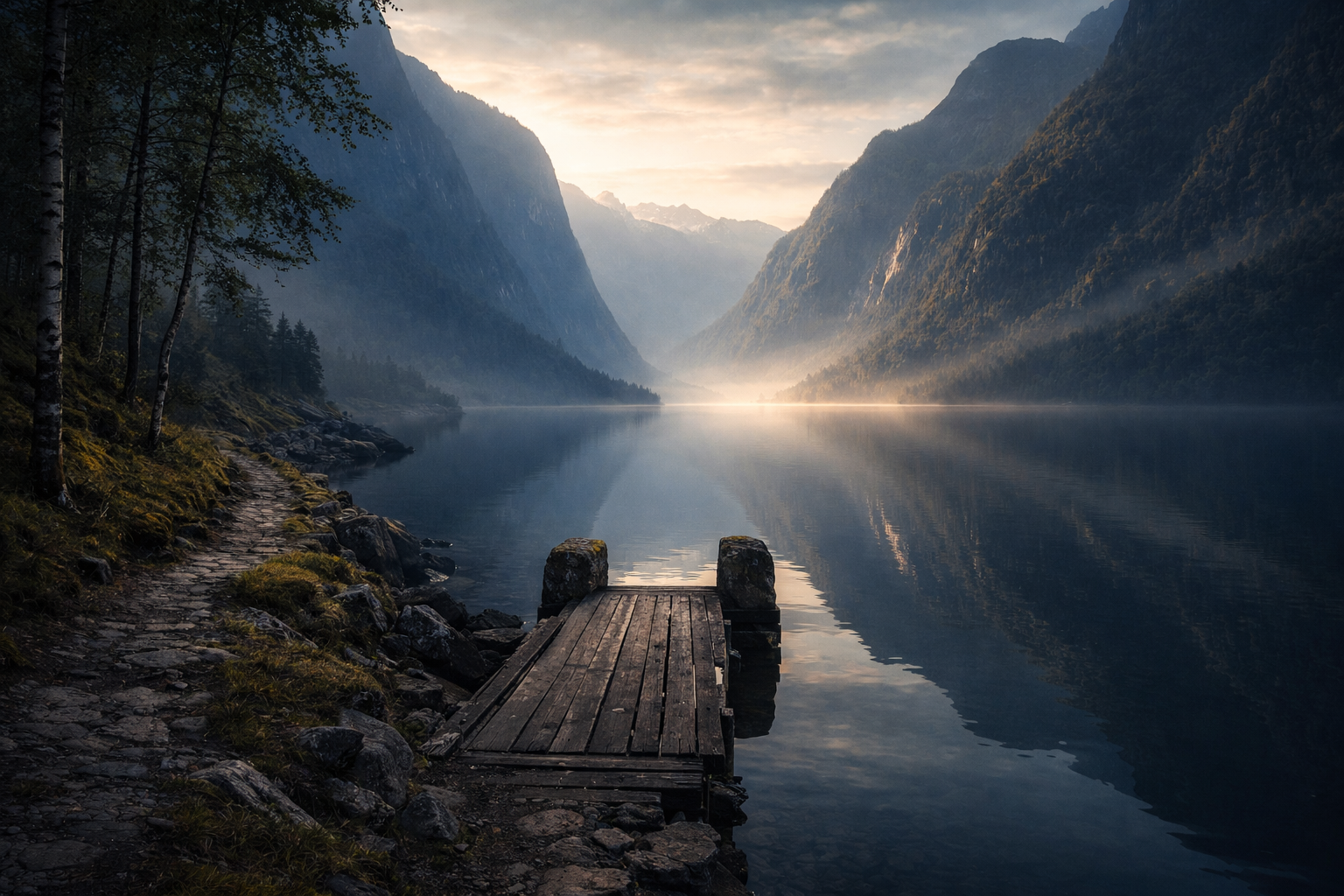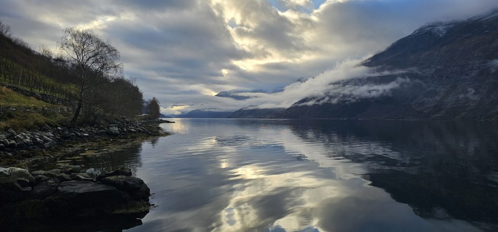 “Ik volg een smal pad langs een Noorse fjord terwijl de ochtend langzaam over het water schuift. De bergen staan stil en hoog aan beide zijden van het dal en hun schaduwen rusten als lange gedachten over het oppervlak van het water. De lucht draagt het zachte licht dat zo vaak hoort bij het noorden, helder en tegelijk ingetogen, alsof het landschap zelf nadenkt over alles wat zich hier ooit heeft afgespeeld.