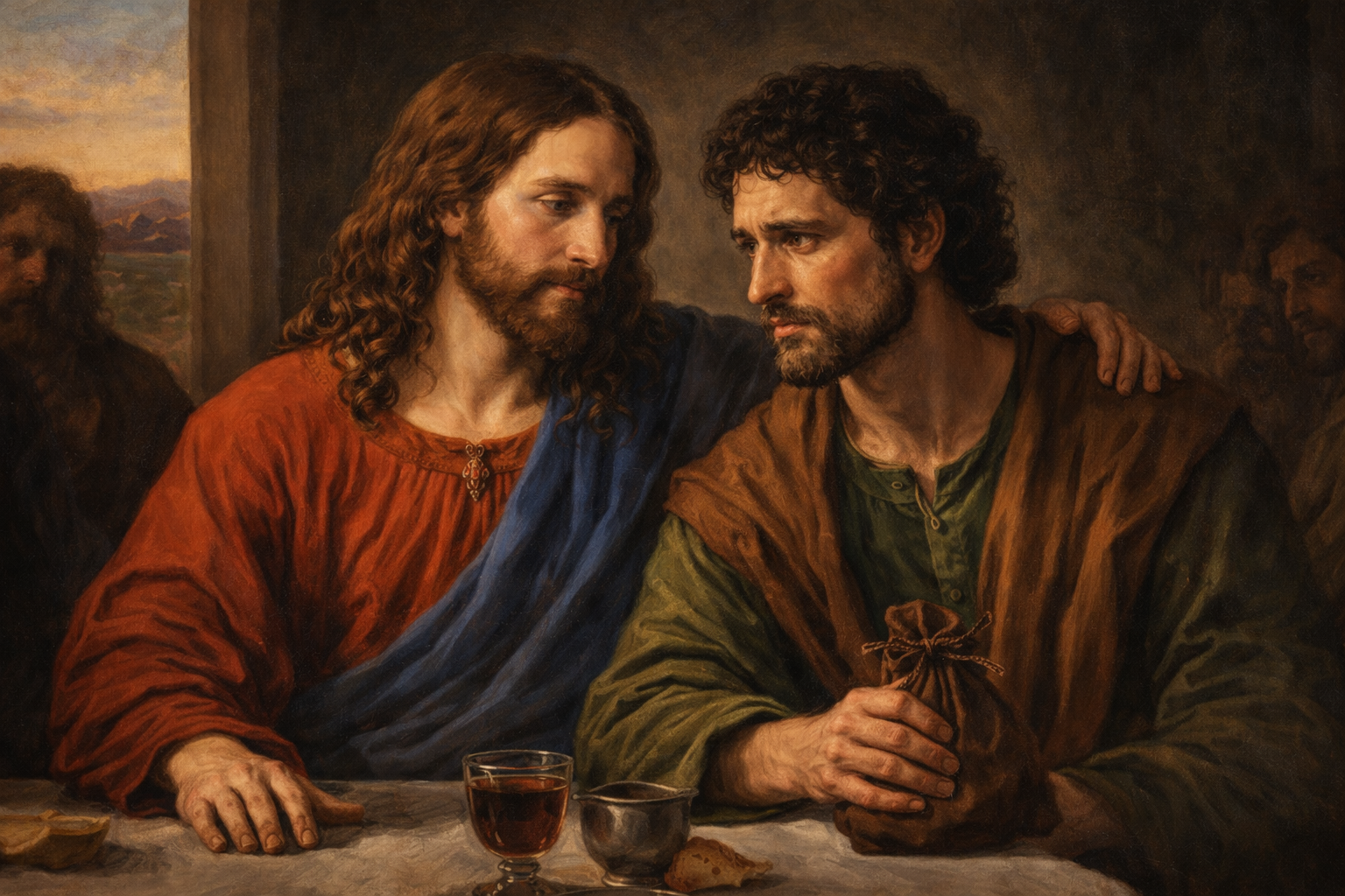 De verhalen laten zien dat Judas geen buitenstaander is. Hij behoort tot de kring van leerlingen. Hij zit aan tafel. Hij beweegt zich tussen de anderen zonder dat hij als afwijkend wordt gezien. Zelfs op het moment dat Jezus spreekt over wat komen gaat, wijst niemand hem aan. De groep blijft intact, de verbinding blijft bestaan.