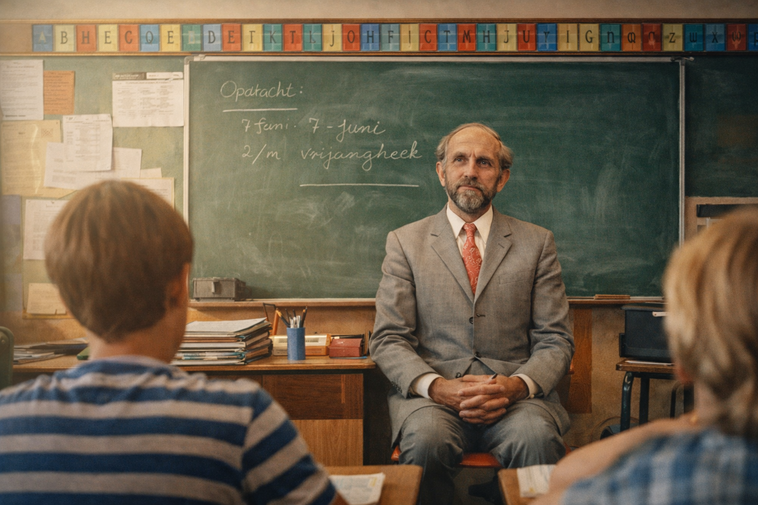 Dat beeld raakte me dieper dan ik had verwacht. Het bracht me terug naar meneer Ooms. Hij was mijn leraar op de MAVO. Een oudere man, zacht, vriendelijk, nooit hard in zijn woorden. Hij had geen natuurlijke overwicht over de klas. Hij werd geplaagd, getest, soms ronduit gepest. Er waren momenten dat hij huilend het lokaal verliet omdat hij de controle kwijt was. Als puber zag ik dat en wist ik niet goed wat ik ermee moest.