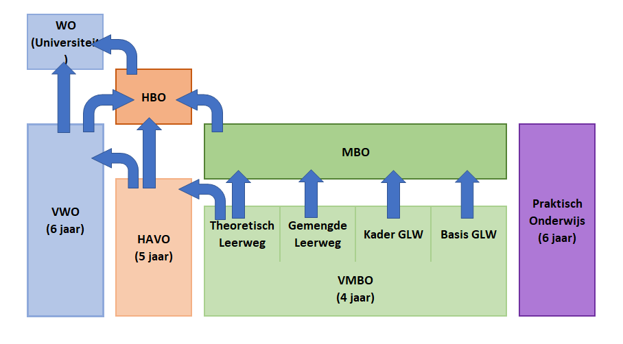 Om een en ander te begrijpen is het van belang dat we snappen hoe het onderwijssysteem grofweg in elkaar zit. In het bovenstaande schema is dit schematisch weer gegeven.