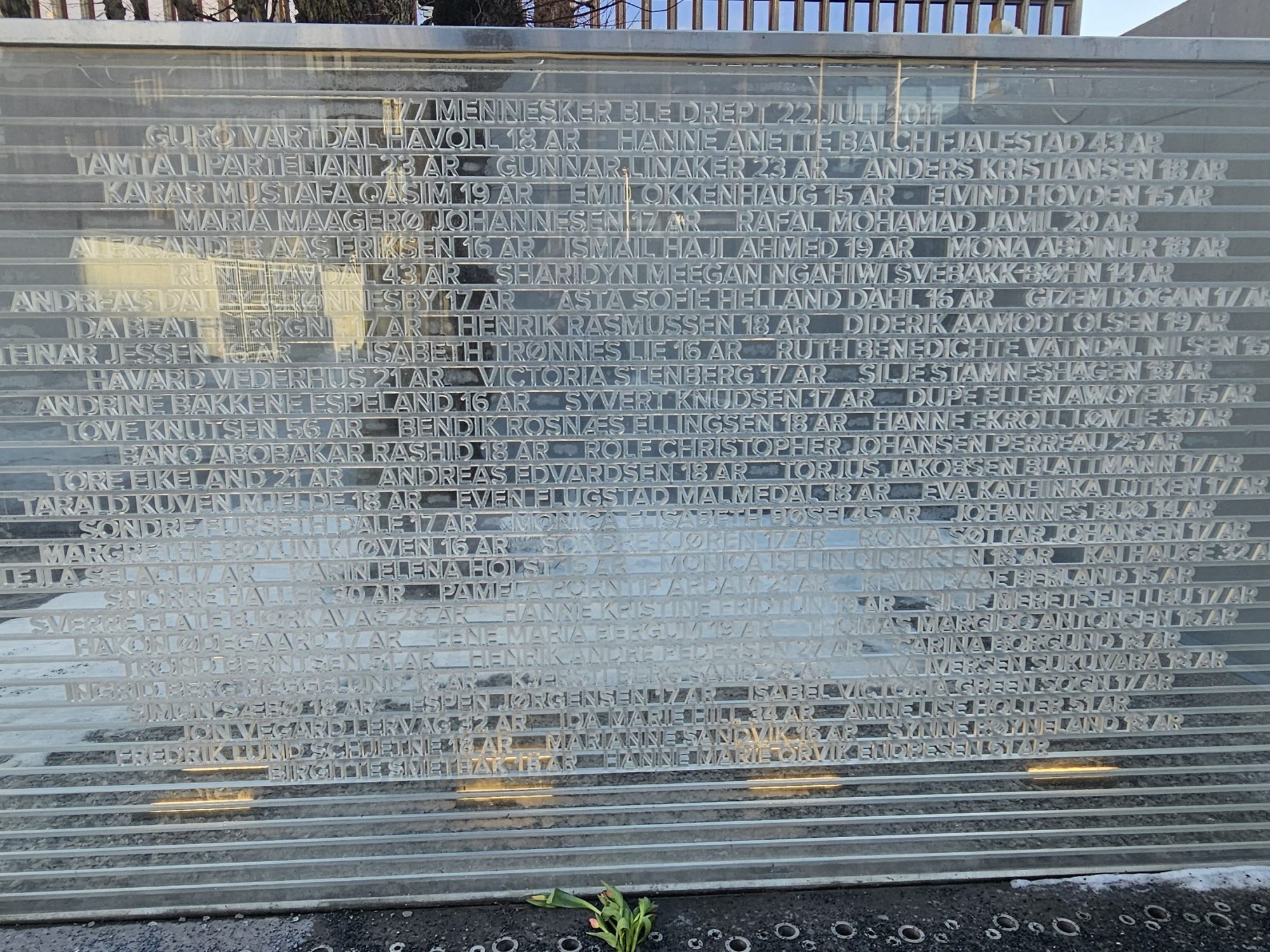 Elke keer als ik in Oslo ben, ga ik langs deze plek. Sta ik even stil bij deze verschrikkelijke dag. Vandaag de dag is mijn angst voor herhaling nog groter dan ooit. Extreem rechts rukt op, op veel plekken in de wereld. Het stemt me verdrietig. En als ik bij de wand met namen sta, lees ik door de namen heen. Ik zie wat bekende namen, maar ik zie vooral de leeftijden… 16, 17, 23, 19: In de knop van hun leven vermoord….