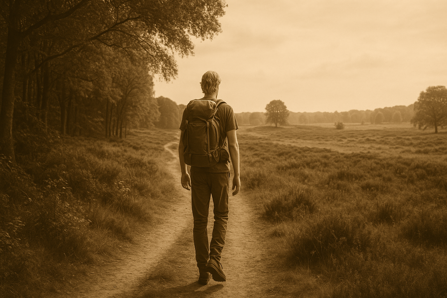 Het pad wordt zwaarder: mul zand, de zon duwt in mijn rug. Dan opent het landschap zich tot een prachtig uitzichtpunt. Daar raak ik in gesprek met een oma van 71 met drie kleinkinderen. Ze lopen stukjes Pieterpad; opa heeft vandaag moeten afhaken door blaren. De kinderen glimmen van plezier. Op de camping slapen zij in de camper, opa en oma in de tent. “Uit veiligheid,” zegt oma; in haar kring is ooit iets vervelends gebeurd met een kind in de tent terwijl de ouders in de camper lagen. Triest om te horen — ik begrijp haar keuze en zorg meteen. De tienermeiden hadden het vast liever anders gezien, maar je voelt liefde in hoe ze het samen oplossen.