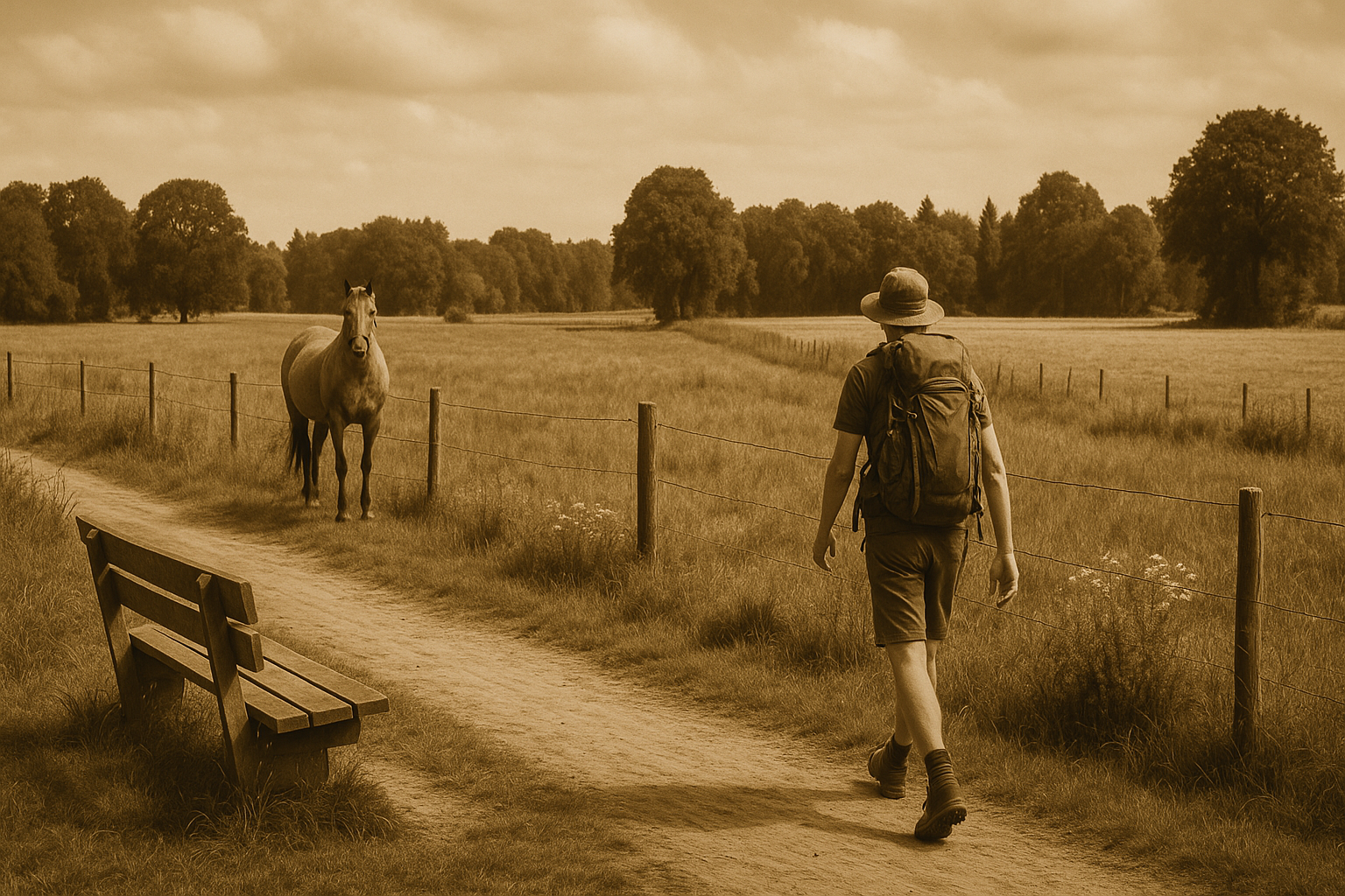 Na zo’n drie kilometer ontmoet ik een vrouw te paard. Het is een IJslands paard, een prachtig dier met sprekende ogen. We raken in een mooi, open gesprek over de herkomst en het karakter van dit bijzondere ras, en natuurlijk komt Walking for Humanity ook ter sprake. Ze besluit me te gaan volgen, en ik vervolg mijn weg richting het zuiden.