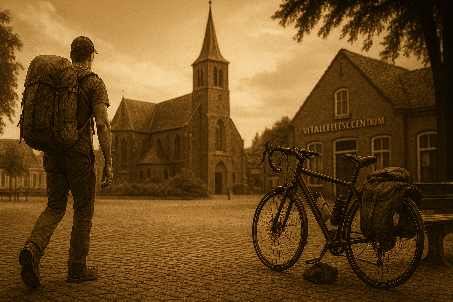 Ze tippen me het gebouw achter hen voor mijn overnachting. Het is het Vitaliteitscentrum Brabant. Ze hadden daar een mooi gesprek met een gastvrouw—een lieve vrouw—en deelden met haar persoonlijke verhalen. Ze denken dat het bij mij en mijn verhaal past. Het zou wel bijzonder zijn, aangezien het dan weer de eerste plek is waar ik “aanbel” op zoek naar een overnachting. Zij stappen snel op de fiets; ze willen 100 km per dag halen (het Pieterpad op de fiets in ongeveer een week) en hebben nog wat kilometers te gaan. We nemen afscheid en ik kijk ze nog even na voor ik naar binnen stap. Wat een mooi en lief stel, en wat fijn dat ze na hun persoonlijke verlies elkaar zo hebben gevonden.